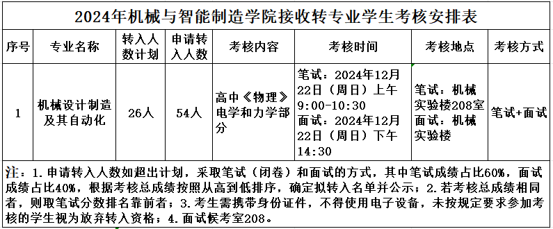 根据《九江学院学生学籍管理办法》、《九江学院学生转专业管理办法(试行)》(九院字【2024】111号)和《关于开展2024级新生转专业工作的通知》等文件精神,因机械设计制造及其自动化专业申请人数超出转入人数计划,需对申请转入的同学进行考核,考核安排如下: