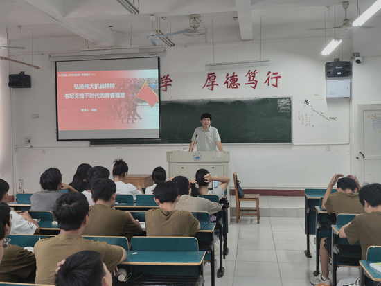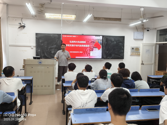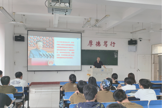 9月26日下午,院党委书记项忠平在义丰楼302为机械A2511、机械A2512班新生讲授思政课第一课??翁蒙希钪移揭约湍钪泄嗣窨谷照秸呤澜绶捶ㄎ魉拐秸だ?0周年大会为切入点,带领学生重温习近平总书记在纪念中国人民抗日战争暨世界反法西斯战争胜利80周年大会上的重要讲话。他强调,伟大的抗战精神是中华民族的宝贵精神财富,是激励我们不断前进的强大动力。同学们是新时代的主力军,肩负着民族复兴的伟大使命,抗战精神不仅仅是历史的记忆,更是我们在新时代拼搏奋斗的精神指引。项书记言谆意重,让同学们深刻认识到,时代的接力棒已经传到自己手中。